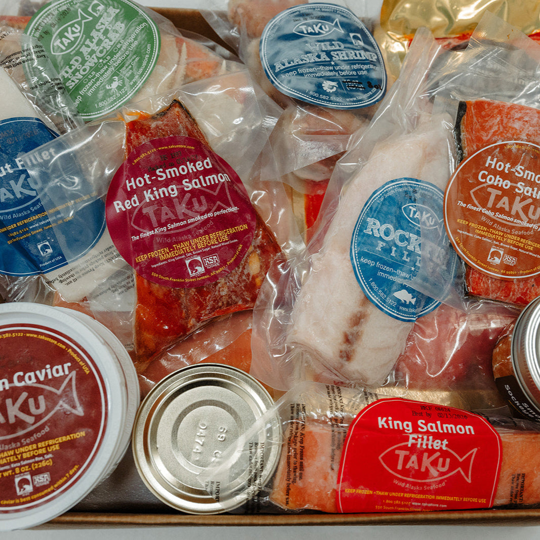A large collection of our top selling items. Get a true taste of Alaska with this combo. Wild Alaskan Sockeye and King Salmon Fillets, Halibut Fillets, Cold and Hot Smoked Sockeye, our famous Salmon spread, Snow crab cocktail claws, and large Spot Prawns.