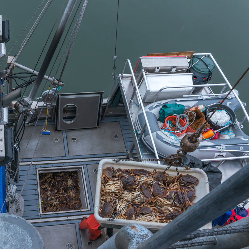 Dungeness Crab are harvested just miles from our dock in Juneau, in relatively shallow coastal waters using circular steel pots. These traps are baited and dropped to the ocean floor, where they rest for a day or two before being retrieved. Only mature male crabs that meet legal size requirements are kept. Females and undersized crabs are returned immediately to protect future generations.